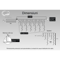 Suprafata luminoasa are un total de 5 m metri. Lungimea prelungitorului este de 3 metri. Ofera posibilitatea de a suspenda ghirlanda astfel incat sa poata fi ascuns cablul de alimentare atunci cand este conectat la priza.